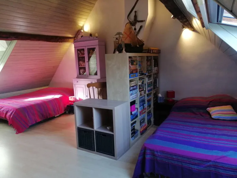 - Suite familiale : à l’étage, une grande chambre de 35m² avec trois lits, salle de bain privative et boudoir d’accueil, parfaite pour les groupes jusqu’à 5-6 personnes.