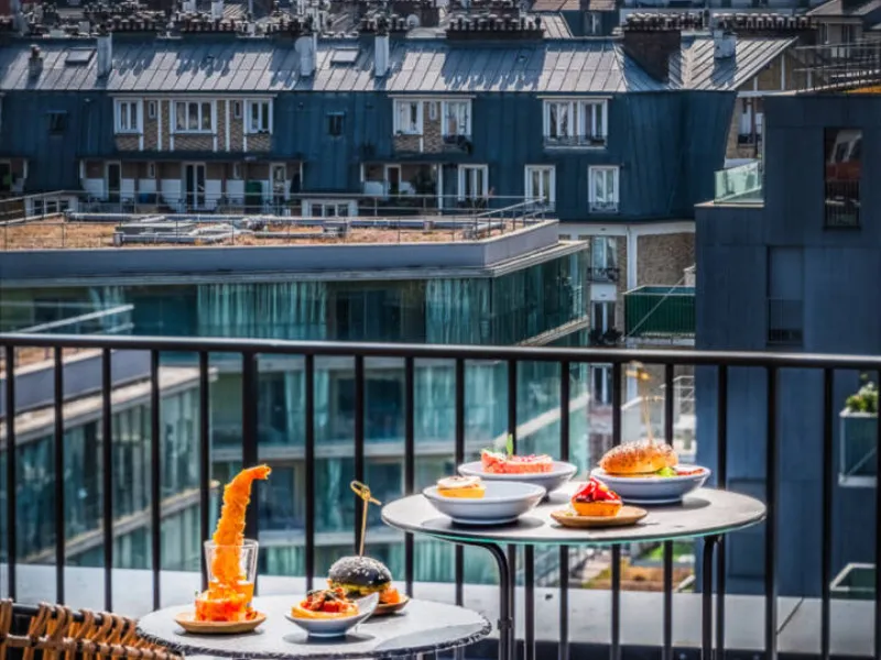 Maison Montmartre is a young structure with a lot to offer! With a great location, I don't know if you know the 18th but we are located at the exit of the ring road and close to the flea market of Saint-Ouen. So super accessible185 comfortable rooms, a rooftop bar with a panoramic view of Paris and its iconic Eiffel Tower & Montmartre hill to share cocktails and tapas, a restaurant, Kitchen M, which offers great seasonal dishes in an intimate and cozy setting.