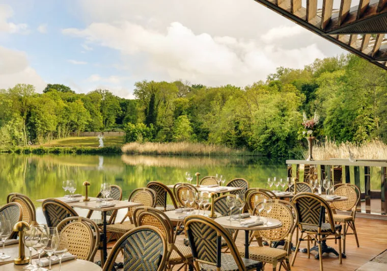 Aux beaux jours, la grande verrière s’ouvre sur les jardins de l’hôtel ainsi que sur son historique ginguette classée du XIXème siècle : Les Paillottes.